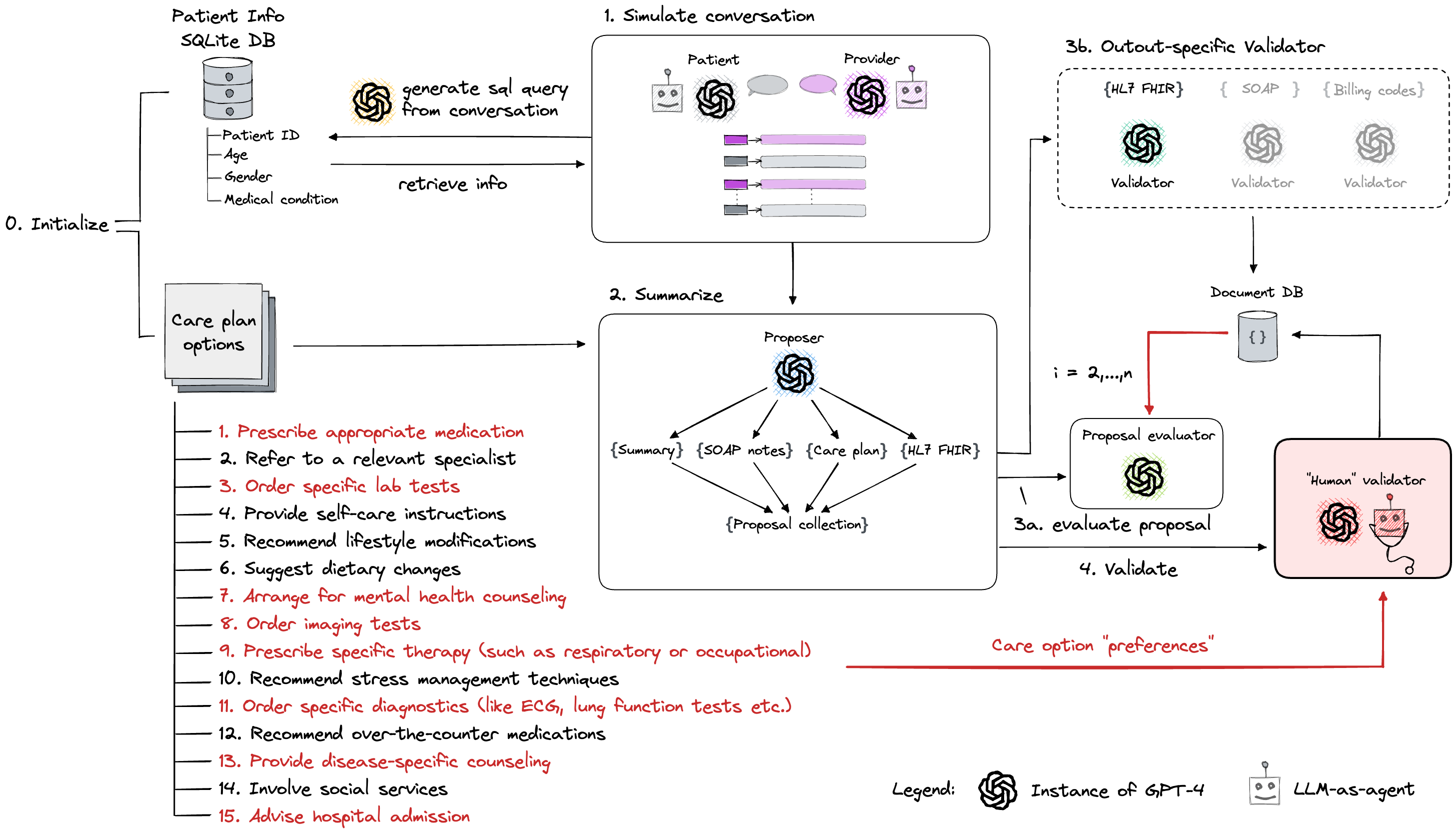 A single agent is used to (1) summarize the conversation, (2) generate notes in the SOAP format, (3) write a summary for the EHR in the HL7 FHIR format, and (4) generate a proposal based on the conversation. Although the LLM could read through the conversation and select a relevant proposal, I explicitly pass a randomly selected proposal from the list. This is done so the evaluator agent (step 3a) can learn the preferences of the agent (step 4) that validates the proposals.