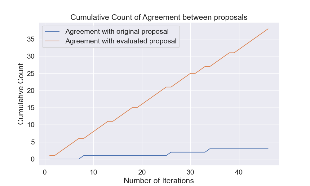 The orange line in figure 2 represents the cumulative number of times that the evaluator agent’s proposal matched the proposal from the validator agent given 50 iterations. The blue line represents the randomly selected original proposal, which serves as a control. The evaluator agent learned from the validation history and generated proposals that better aligned with the validator preferences.